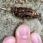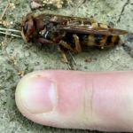 Außerdem habe ich schon wieder ein paar neugierige Hornissen herumfliegen sehen. Sie sind leider immer zu schnell, als dass ich sie fotografieren könnte. Neulich beim Müllrunterbringen habe ich im Hinterhof auf dem Boden eine tote Hornisse entdeckt, also nichts wie fotografiert, meine Finger und mein Müllschlüssel zum Größenvergleich: