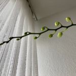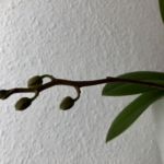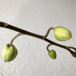 Die weißblühende Riesenorchidee habe ich letztes Jahr von den Schwiegereltern bekommen. Sie hatte damals zwei Blütentriebe und dieses Jahr einen mit 14 Knospen bekommen, wovon sich bisher alle gut entwickelt haben. Momentan sind schon acht Blüten geöffnet. Ich verzichte auf Stäbe, weil es mir viel besser gefällt, wenn die Blütentriebe der Schmetterlingsorchideen frei wachsen. Es stört mich auch nicht, wenn sich die Orchideen, wie es ihrem Naturell entspricht, irgendwann in Schräglage neigen. Man kann ja den Topf so platzieren und beschweren, dass nichts umfällt. Außerdem kann so kein Wasser in der Krone zurückbleiben und Fäulnis verursachen.